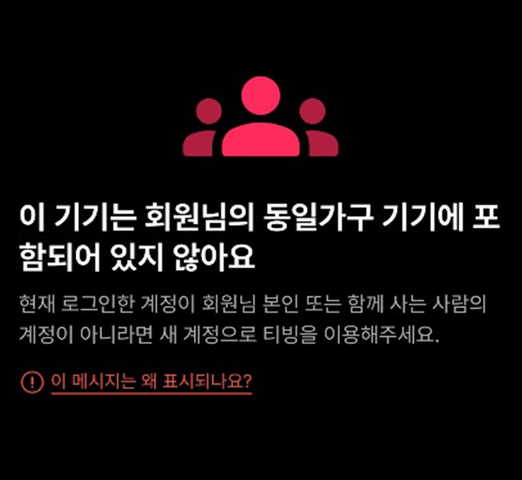- ④ VPN 또는 프록시 사용 — 해외 접속이나 VPN을 사용하면 티빙이 동일가구로 인식하지 못합니다.