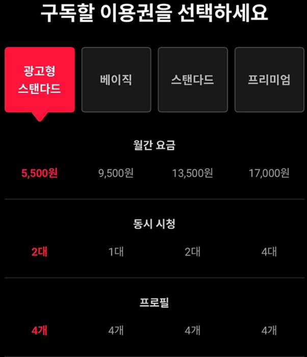 - 동시 시청: 광고형 2대 / 베이직 1대 / 스탠다드 2대 / 프리미엄 4대