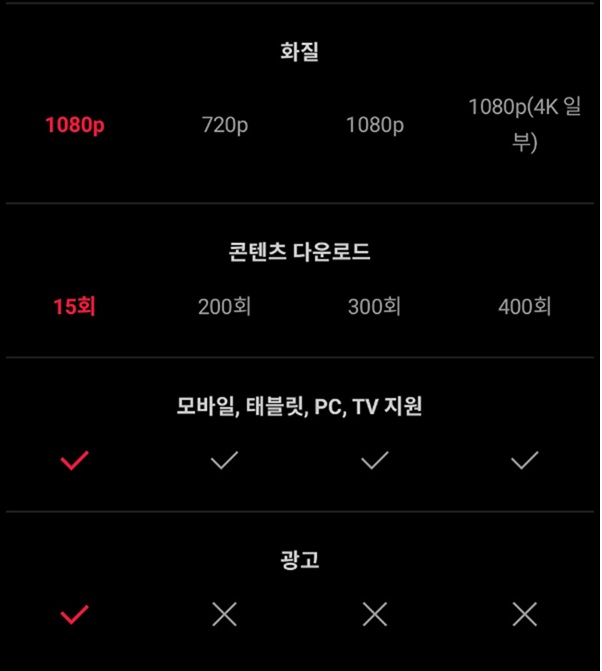 - 화질: 광고형 1080p / 베이직 720p / 스탠다드 1080p / 프리미엄 1080p(일부 4K 지원)